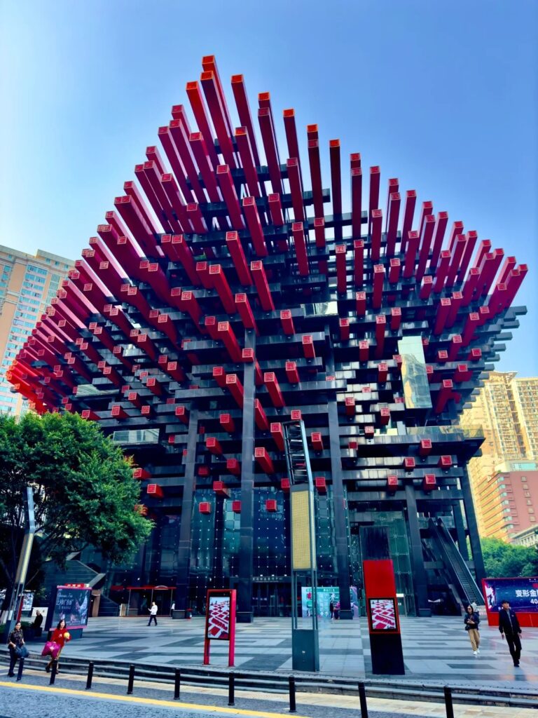 ● Check-in tại Bảo tàng Mỹ thuật Trùng Khánh (toà nhà “đũa”) nằm trong tòa nhà màu đỏ có thiết kế ấn tượng. Lấy cảm hứng từ những đôi đũa, tòa nhà là sự pha trộn của phong cách truyền thống và hiện đại. Là địa điểm check in không thể không check-in khi đến với Trùng Khánh (chụp hình bên ngoài ), đường Nam Tân (Nanbin Lu)