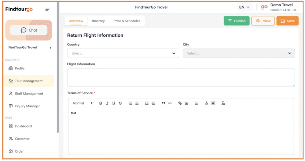 Bạn đã có tài khoản xác minh và hồ sơ công ty chuyên nghiệp. Bây giờ, là lúc quan trọng nhất: đưa sản phẩm của bạn lên kệ hàng trực tuyến. Việc đăng tour trên Findtourgo được thiết kế đơn giản nhưng đầy đủ tính năng để bạn mô tả sức hấp dẫn của chuyến đi.