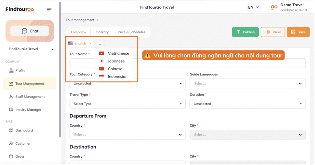Trong bài viết này, chúng tôi sẽ hướng dẫn bạn quy trình tạo một tour hoàn chỉnh thông qua 3 thẻ tính năng chính: Tổng quan, Lịch trình và Giá cả.