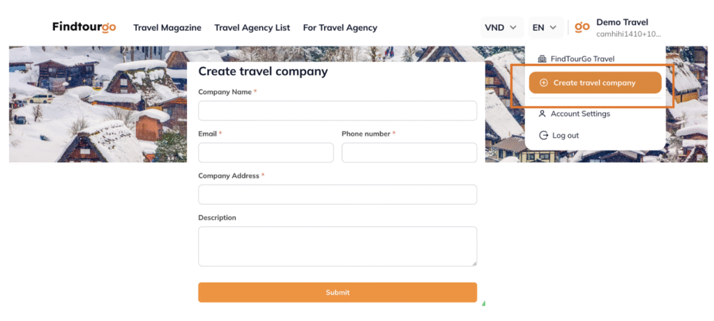 Tạo công ty mới: Chọn mục “Create travel company” (Tạo công ty du lịch) trong danh sách xổ xuống.
