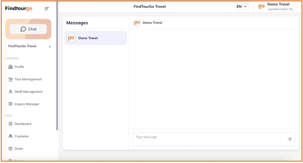 Đầu tiên, bạn truy cập vào mục Chat trên thanh menu. Tại đây, bạn có thể trò chuyện trực tiếp với khách, giải đáp thắc mắc về lịch trình hay thương lượng giá cả. Giao diện chat trực quan giúp bạn dễ dàng theo dõi lịch sử trao đổi để đưa ra phương án tư vấn tốt nhất.