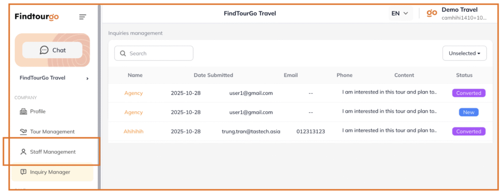 Đây là bước quan trọng để phân loại khách hàng. Trong mục Quản lý yêu cầu (Inquiry Manager), bạn có thể kiểm soát xem khách nào đang quan tâm đến tour nào.