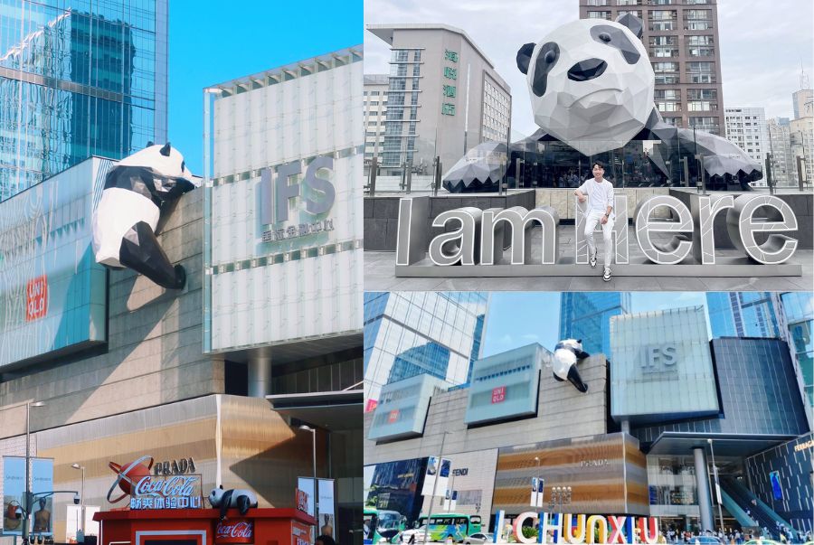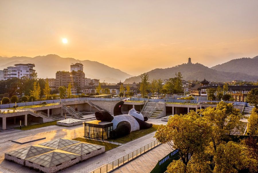 Quảng Trường Ngưỡng Thiên Oa – nơi có bức tượng chú gấu trúc khổng lồ tên Selfie Panda. Bức tượng được lấy cảm hứng từ câu chuyện có thật, về chú gấu trúc đi lạc trong khu trung tâm Đô Giang Yển. Từng gây sốt trên mạng xã hội Trung Quốc hồi năm 2005. Tượng gấu khổng lồ mô phỏng “quốc bảo” của Trung Quốc đang cầm cây gậy selfie. Nằm chụp ảnh trên bãi cỏ xanh, một chân gác lên lồng kín